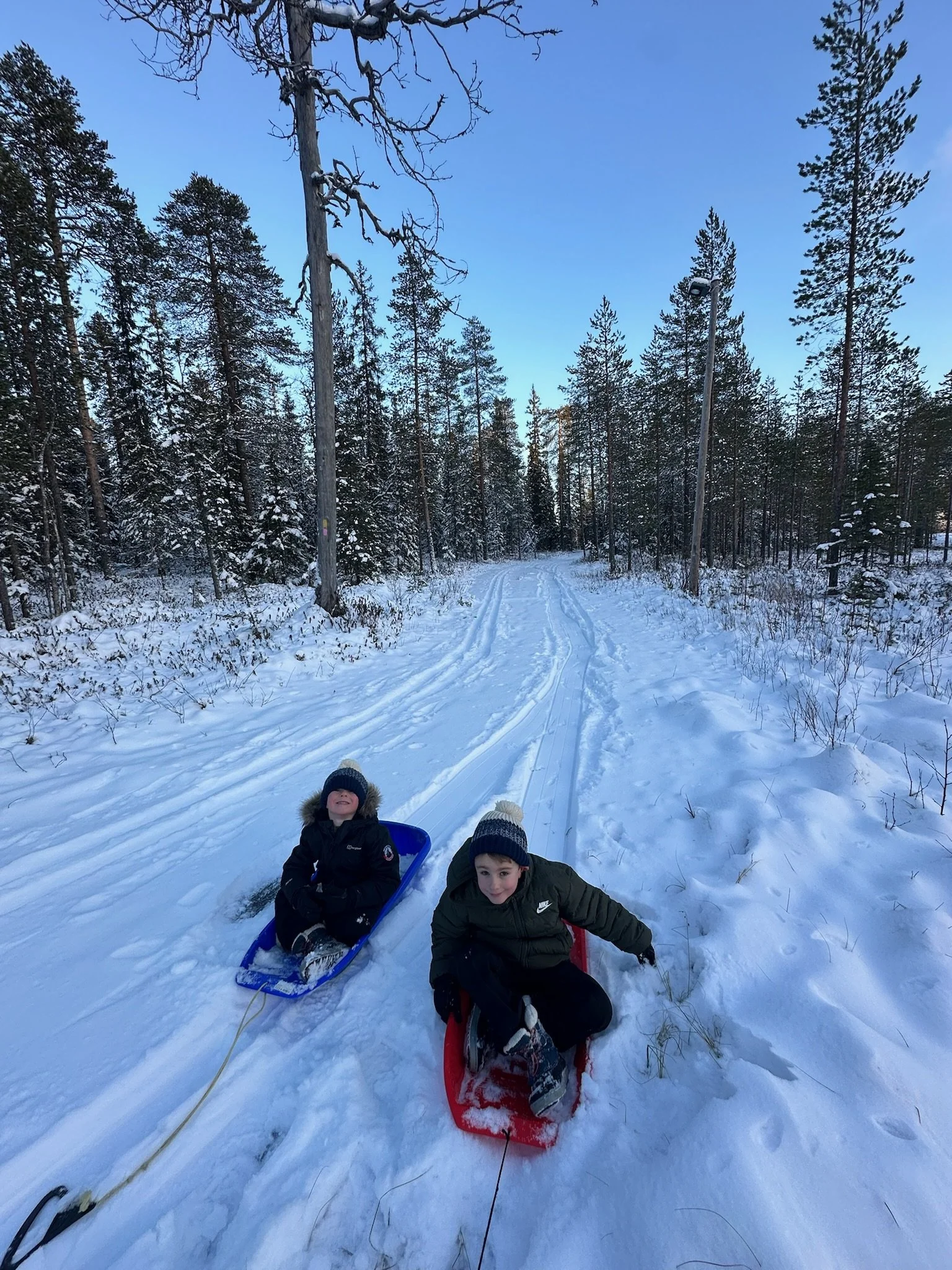 During winter, many parks in Rovaniemi have small hills perfect for sledging. We found sledges laying around (which we assume is typical), but local stores also offer them cheaply. Our kids really enjoyed sliding down the slopes at a city centre park further down the river, and at the Angry Birds park.